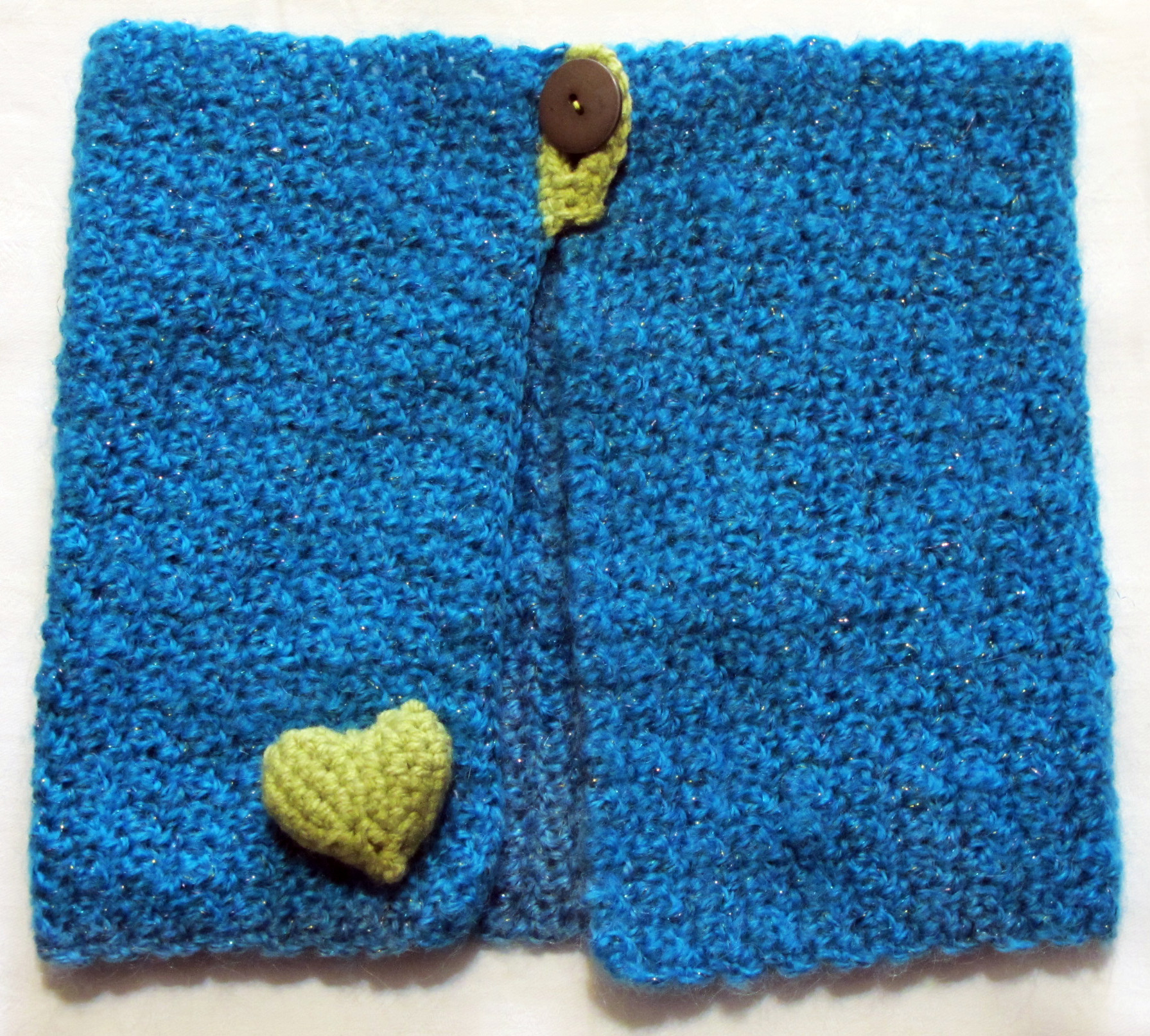 I designed and hand crocheted this item from turquoise soft wool yarn. I added a green heart-shaped brooch, you can eventually move wherever you want. The neck warmer is closed with a vintage button (at least 30 year old!!).