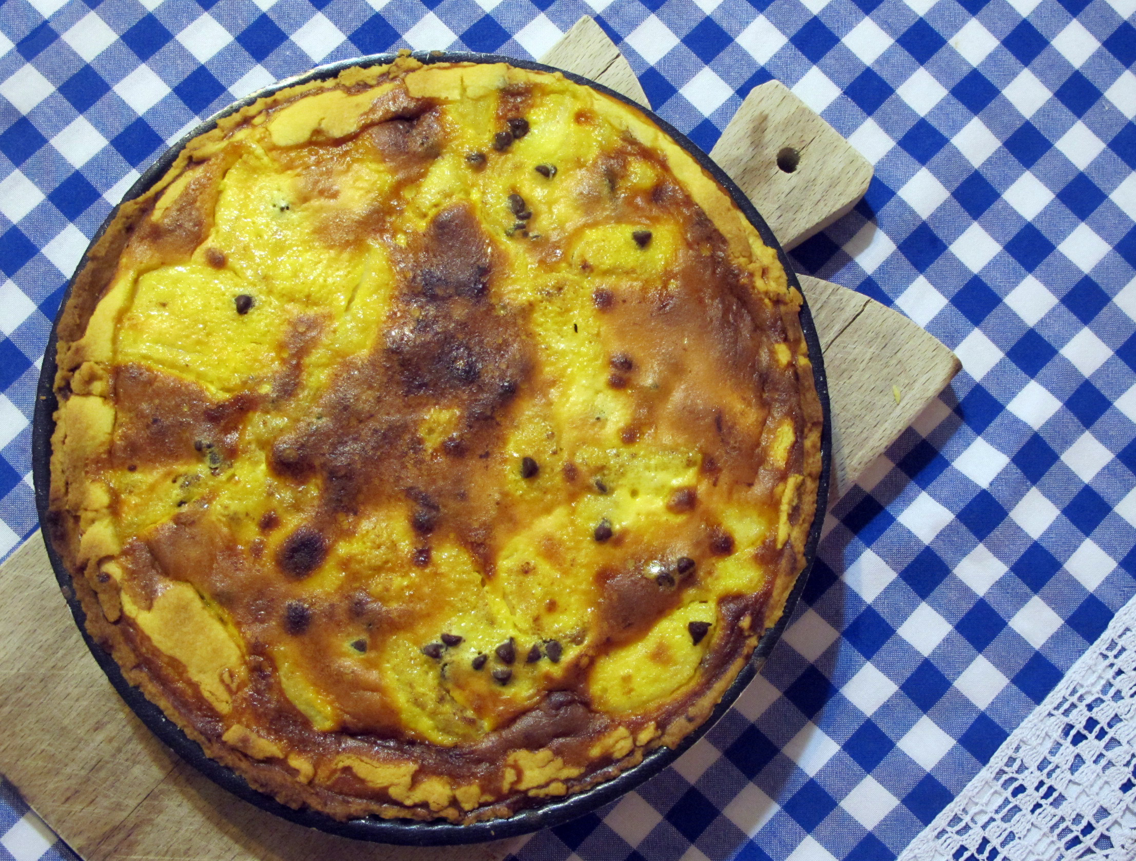 Per la pastafrolla: 220 gr di farina, 110 gr di burro morbido, 50 gr di zucchero, 1 tuorlo d’uovo. Per la farcitura: 4 pere, succo di 1 limone, cannella, scaglie di cioccolato fondente. Per la crema: 100 gr di zucchero, 1 limone grattugiato, 1 pizzico di sale, 3 uova, 200 gr di panna, 2 cucchiai di succo di limone.